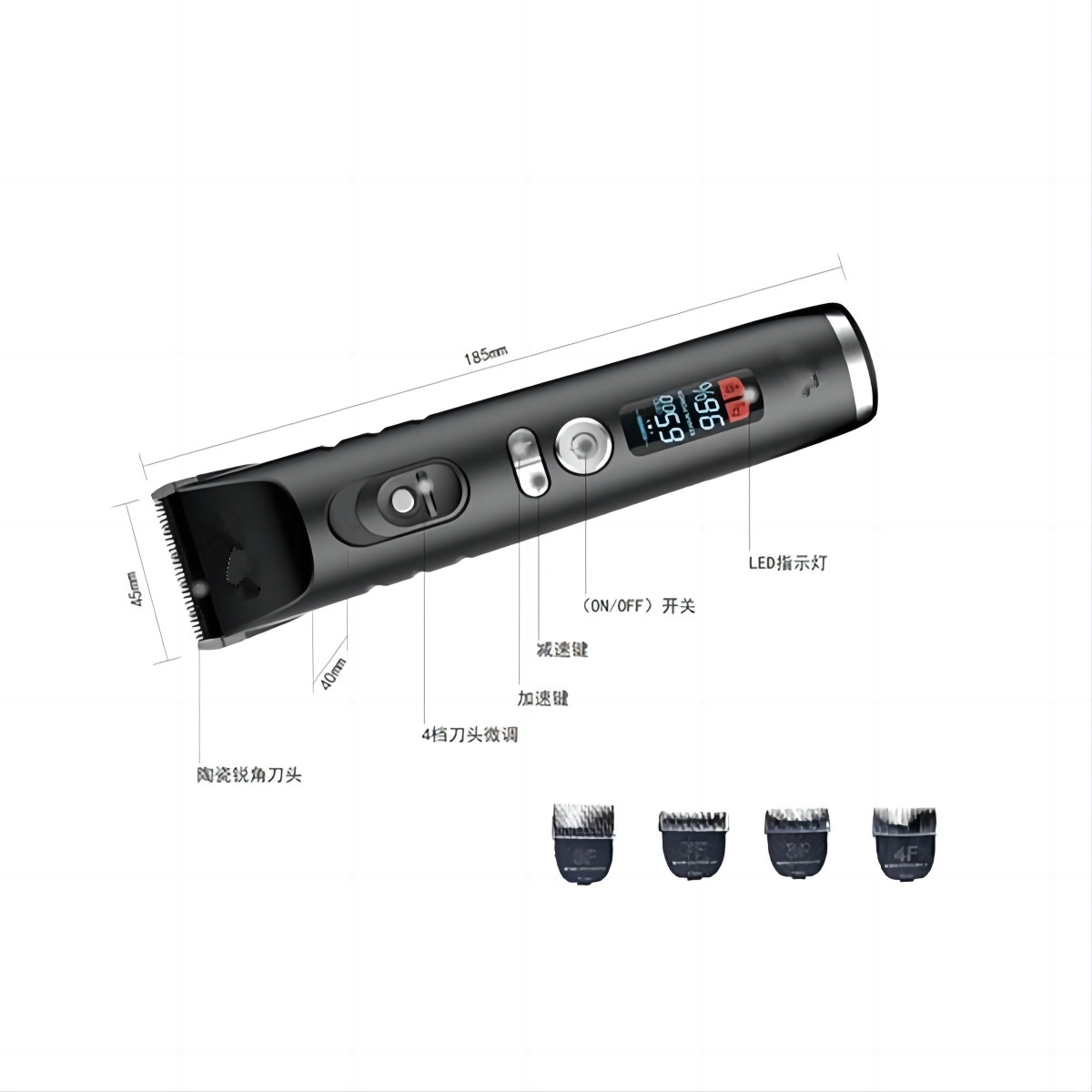 • ہائی ڈیفینیشن ایل ای ڈی اسکرین ریئل ٹائم میں بیٹری کی سطح کو ظاہر کرتی ہے، جو کہ گرومنگ کے دوران بجلی کی رکاوٹوں کو روکتی ہے اور گھر کی ہموار گرومنگ یا سیلون خدمات کو یقینی بناتی ہے۔